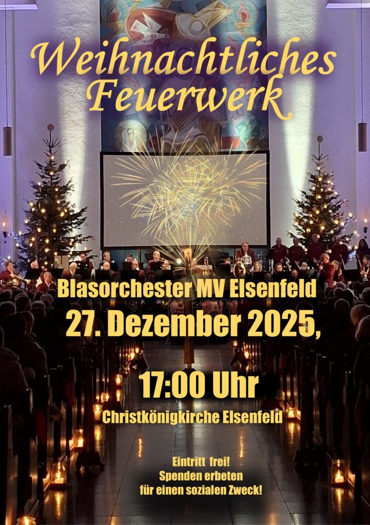 Zum Ausklang der festlichen Tage und als schwungvolle Brücke ins neue Jahr laden wir Sie herzlich zu unserem Konzert „Weihnachtliches Feuerwerk“ am 27. Dezember 2025, 17 Uhr, in der Christkönigkirche Elsenfeld ein.